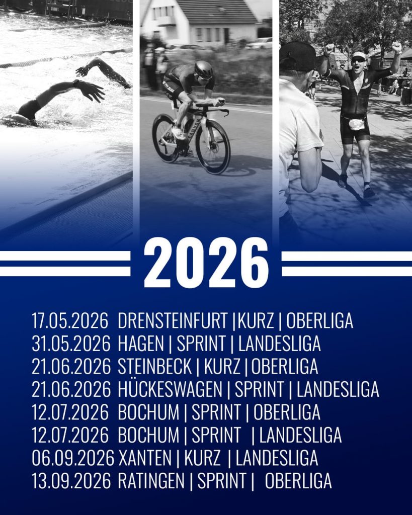 Wir treten 2026 in der Oberliga Männer und Landesliga Süd I+II der NRW Triathlon-Liga an – hier sind die wichtigsten Termine:
